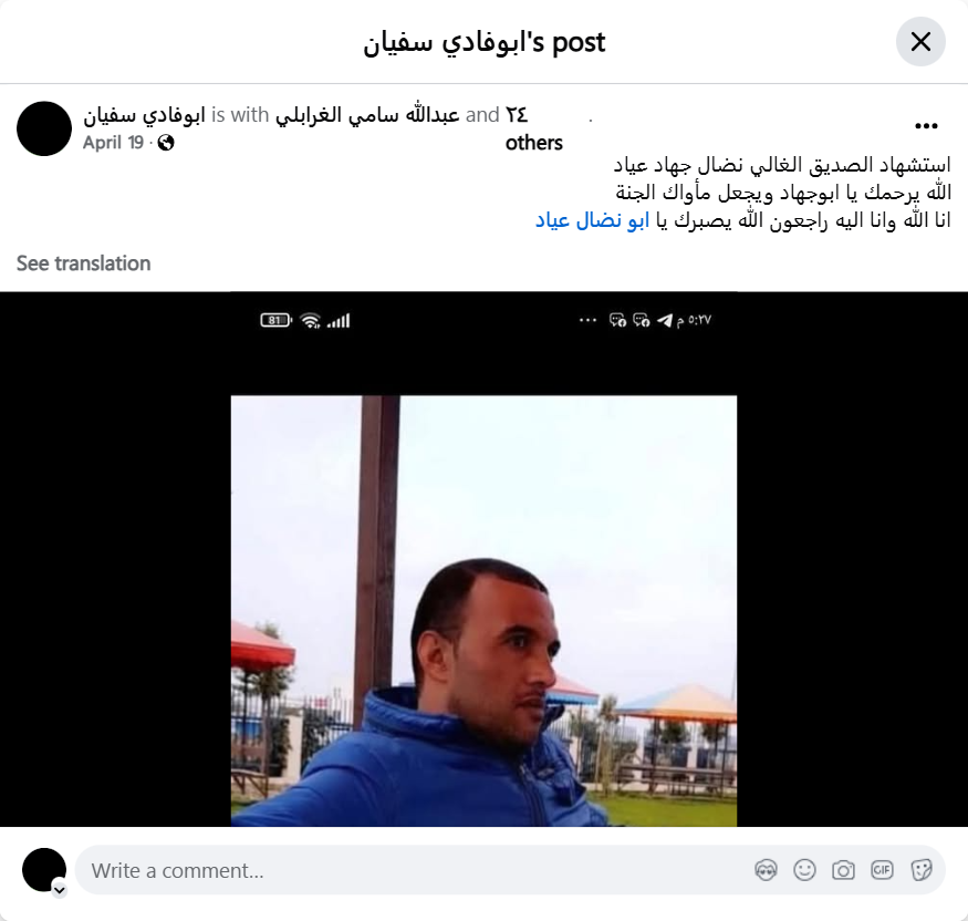 The martyrdom of our dear friend, Nidal Jihad Ayyad. May God have mercy on you, Abu Jihad, and grant you Paradise. To God we belong and to Him we shall return. May God give you patience, Abu Nidal Ayyad.