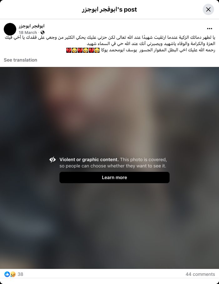 How pure was your pure blood when you ascended as a martyr to God Almighty, but my sadness for you speaks volumes about my pain over your loss, my brother. In you is pride, dignity, and loyalty, O martyr. What consoles me is that you are alive in the heavens as a martyr with God. May God have mercy on you, my brother, the brave, courageous hero, Youssef Abu Muhammad Yuka.