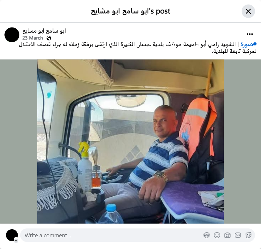 #Photo | Martyr Rami Abu Ta'ima, an employee of the Abasan al-Kabira Municipality, was martyred along with his colleagues when the occupation forces bombed a municipal vehicle.
