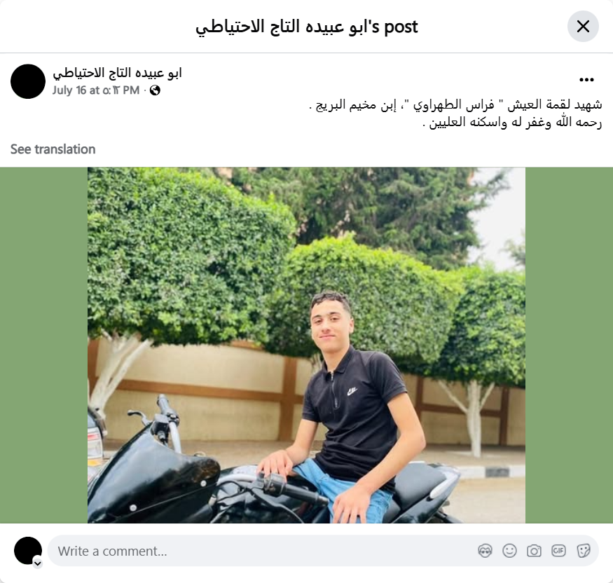 Martyr of livelihood "Firas Al-Tahrawi", son of Al-Bureij camp.