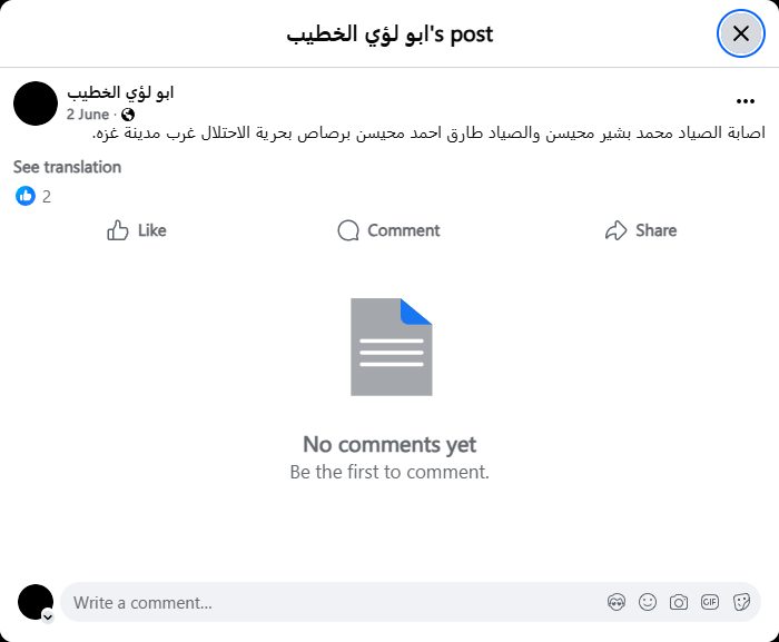اصابة الصياد محمد بشير محيسن والصياد طارق احمد محيسن برصاص بحرية الاحتلال غرب مدينة غزه.