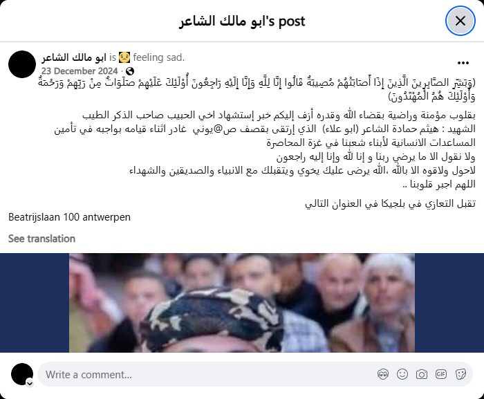 The martyr: Haitham Hamada Al-Shaer (Abu Alaa), who was killed by a treacherous Zionist bombing while performing his duty in providing humanitarian aid to our people in besieged Gaza.