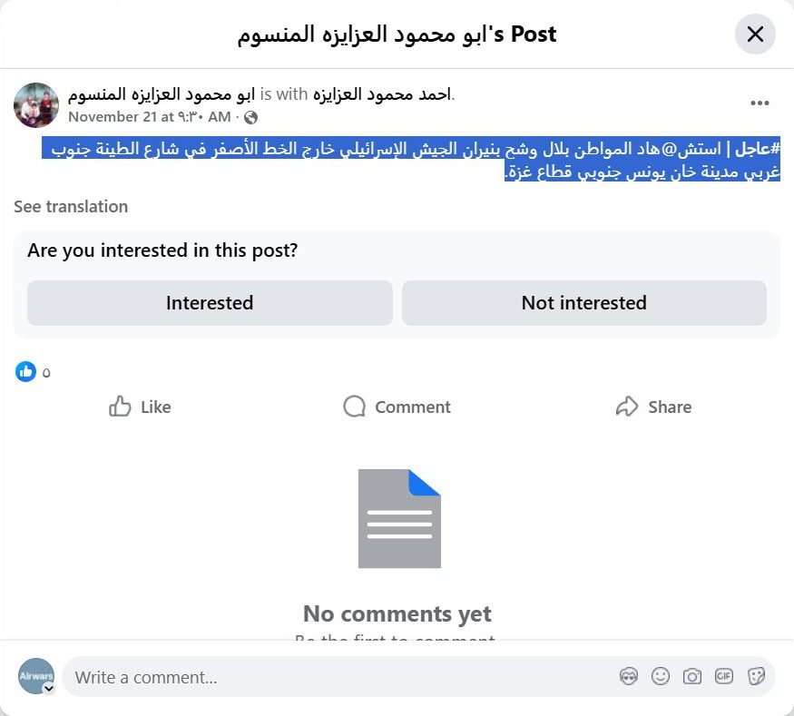 #Urgent | Citizen Bilal Washah was martyred by Israeli army fire outside the yellow line in Al-Tina Street, southwest of Khan Yunis city, southern Gaza Strip.