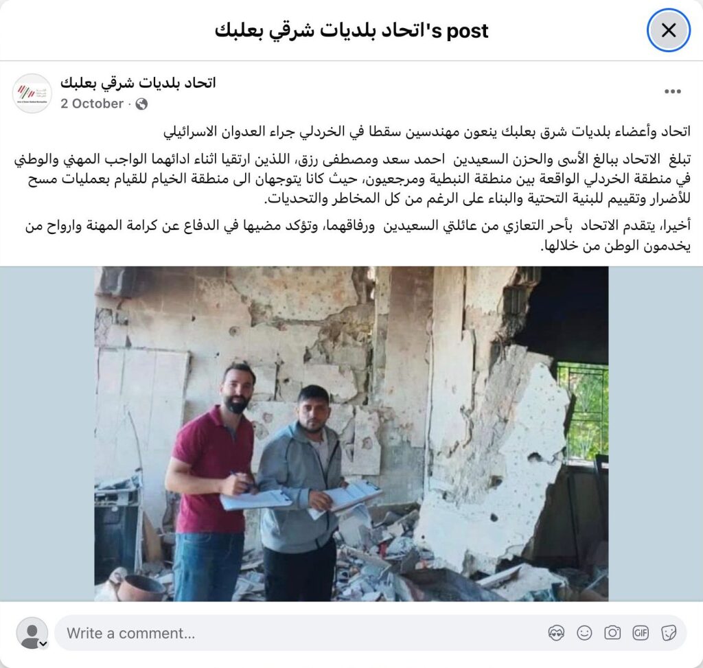 The Union and members of the municipalities of East Baalbek mourn the loss of two engineers who fell in Khardali as a result of the Israeli aggression.