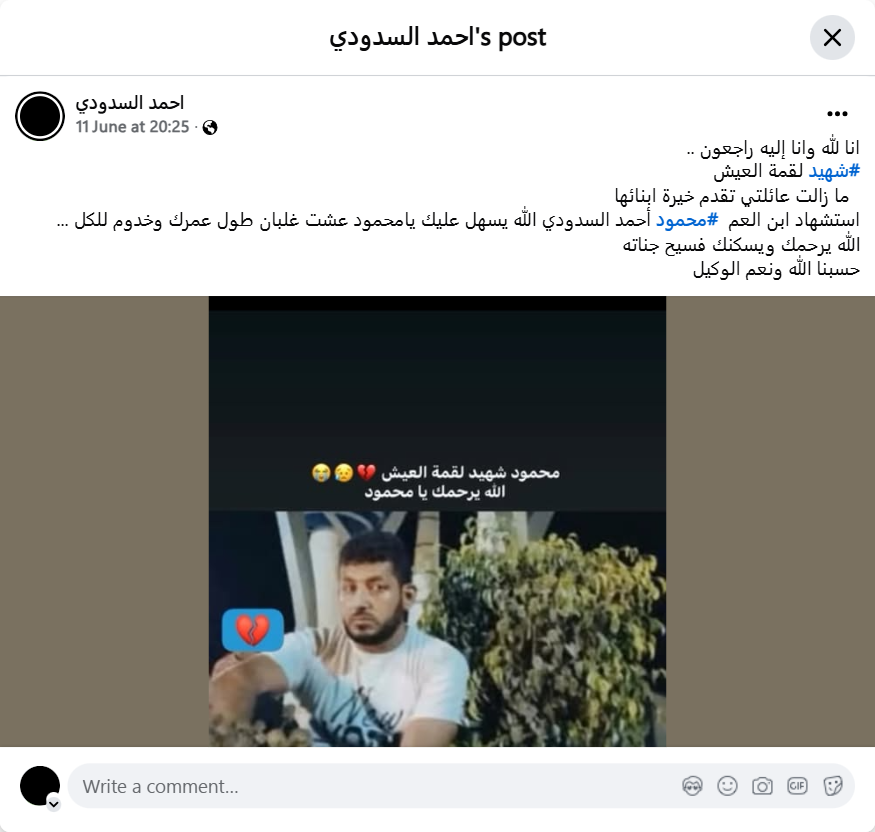 We belong to Allah and to Him we shall return..#Martyr of livelihood My family continues to offer the best of its sons The martyrdom of our cousin #Mahmoud Ahmed Al-Sudoudi May Allah make it easy for you, Mahmoud. You lived in poverty all your life and were helpful to everyone... May Allah have mercy on you and grant you a place in His spacious gardens. Allah is sufficient for us, and He is the best Disposer of affairs.