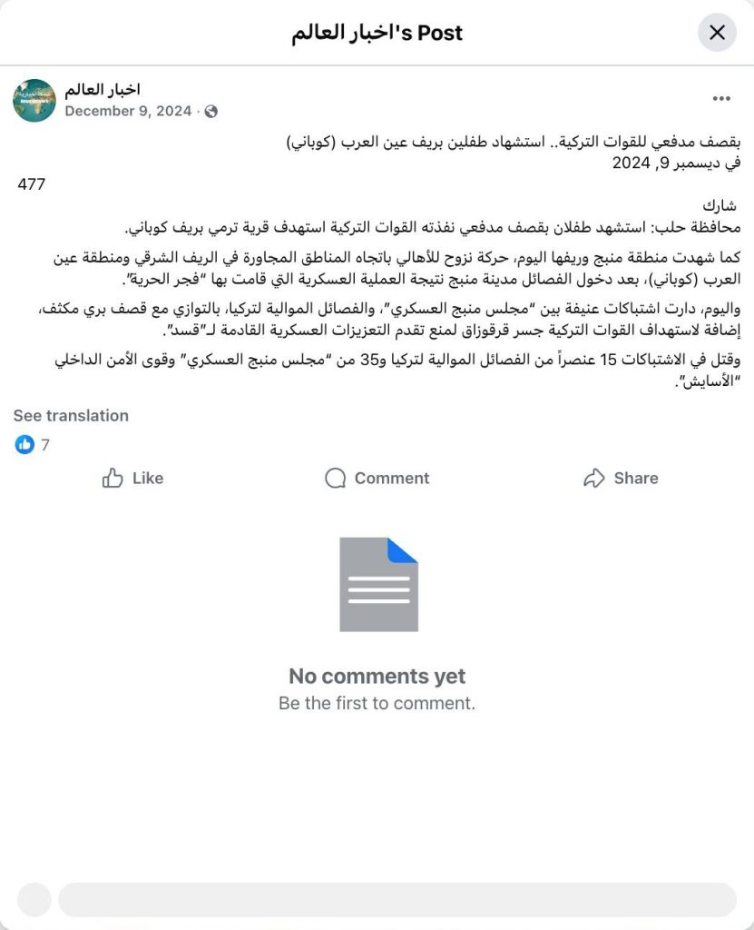 Archive URL: https://airwars.org/source/www-facebook-com-%d8%a7%d8%ae%d8%a8%d8%a7%d8%b1-%d8%a7%d9%84%d8%b9%d8%a7%d9%84%d9%85-pfbid02ppzshfrc45mqxrk1uuqvtck3mqgbrx5kj2pyuab8oq9x5a2lx6k5tmkxppntwfbtl-2024-12-09-170000/