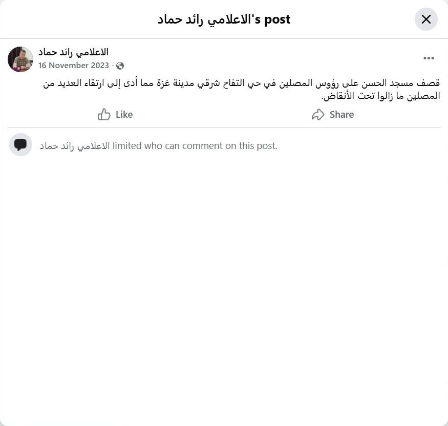 The Al-Hassan Mosque was bombed while worshippers were inside in the Al-Tuffah neighborhood, east of Gaza City, resulting in the deaths of many worshippers who are still under the rubble.