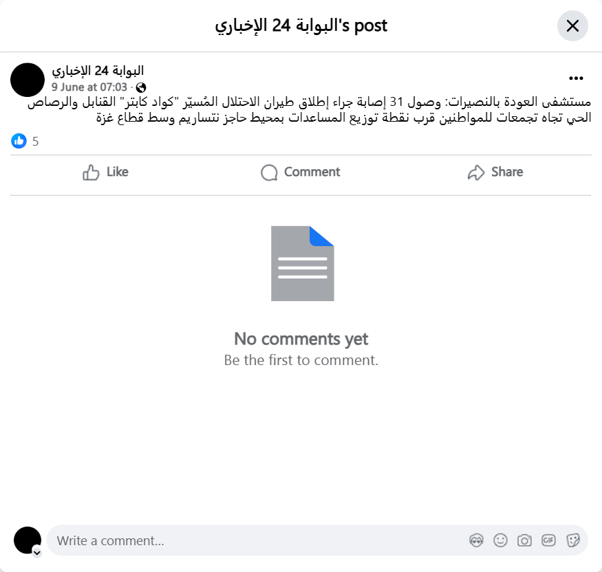 Al-Awda Hospital in Nuseirat: 31 wounded people were admitted after Israeli drones fired bombs and live bullets at crowds of civilians near the aid distribution point near the Netzarim checkpoint in the central Gaza Strip.