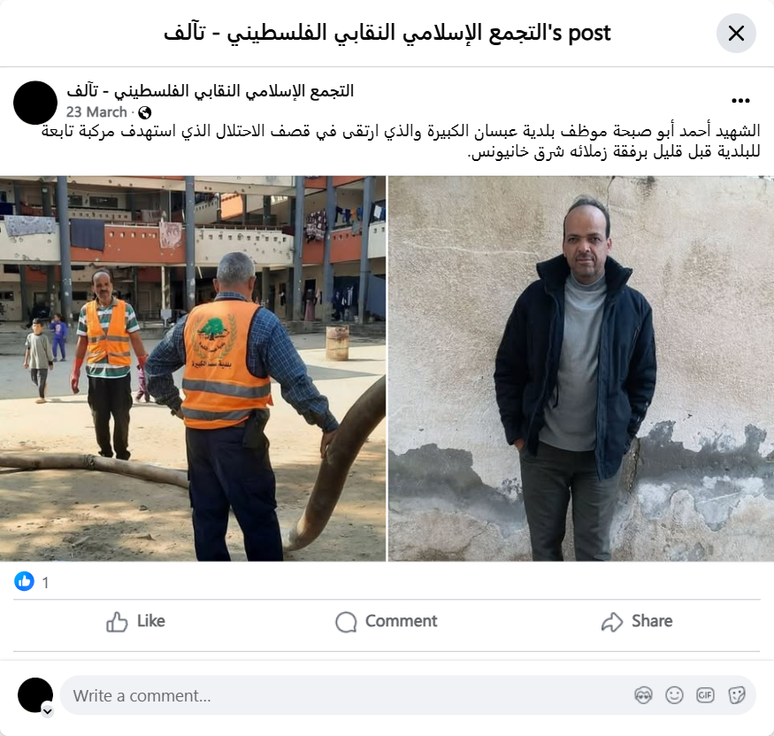 Martyr Ahmed Abu Subha, an employee of the Abasan al-Kabira municipality, was killed along with his colleagues in an Israeli airstrike targeting a municipal vehicle a short while ago east of Khan Yunis.