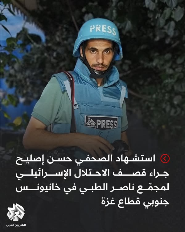 استهدف جيش الاحتلال الإسرائيلي مجمع ناصر الطبي في مدينة خانيونس، ما أدى إلى استشهاد شخصين، أحداهما الصحفي الجريح حسن إصليح وإصابة آخرين.وأفاد مراسل "التلفزيون العربي" في مجمع ناصر الطبي صالح الناطور، بأنّ مسيّرة إسرائيلية استهدفت قسم الحروق في مجمع ناصر الطبي حيث يتواجد الزميل الصحفي حسن إصليح الذي كان يتلقّى العلاج من إصابة سابقة منذ شهر في استهداف طيران الاحتلال خيمة كان يوجد فيها عدد من الصحفيين في خانيونس.وأشار مراسلنا إلى اشتعال النيران في مبنى الطوارئ بمجمع ناصر بعد قصفه.وأكد أنّ قصف مستشفى ناصر كان عملية "اغتيال متعمّدة" استهدفت الصحفي إصليح.وباستشهاد الصحفي إصليح، ارتفع عدد شهداء الأسرة الصحفية منذ بدء حرب الإبادة الجماعية الإسرائيلية إلى 215 صحفيًا وصحفية.