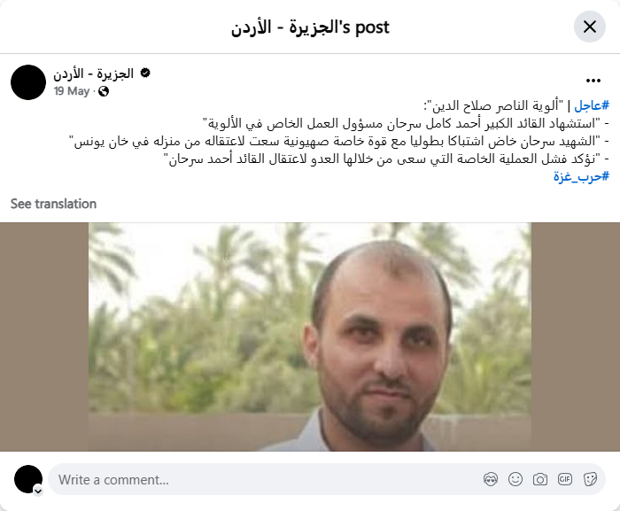 #عاجل | "ألوية الناصر صلاح الدين": - "استشهاد القائد الكبير أحمد كامل سرحان مسؤول العمل الخاص في الألوية"- "الشهيد سرحان خاض اشتباكا بطوليا مع قوة خاصة صهيونية سعت لاعتقاله من منزله في خان يونس"- "نؤكد فشل العملية الخاصة التي سعى من خلالها العدو لاعتقال القائد أحمد سرحان"#حرب_غزة