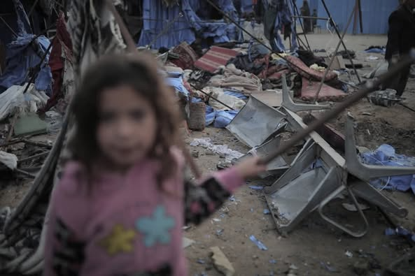 The effects of the occupation's bombing of a tent in the courtyard of Al-Aqsa Martyrs Hospital in Deir al-Balah, central Gaza Strip.