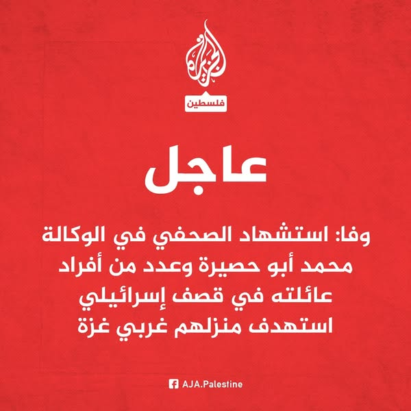#عاجل | وفا: استشهاد الصحفي في الوكالة محمد أبو حصيرة وعدد من أفراد عائلته في قصف إسرائيلي استهدف منزلهم غربي #غزة