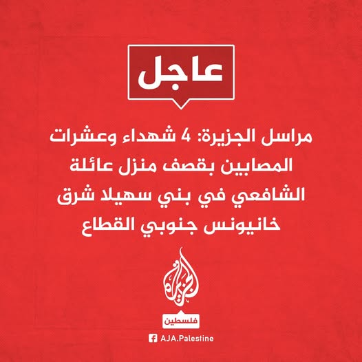 Urgent | #AlJazeera correspondent: 4 martyrs and dozens injured in the bombing of the Al-Shafi'i family home in Bani Suhaila, east of Khan Yunis, in the southern Gaza Strip.