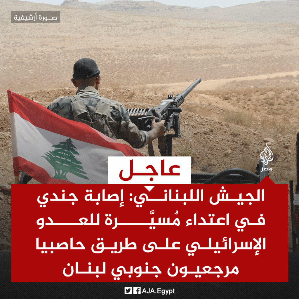 عاجل | الجيش اللبناني: إصابة جندي في اعتداء مٌسيَّرة للعدو الإسرائيلي على طريق حاصبيا مرجعيون جنوبي لبنان