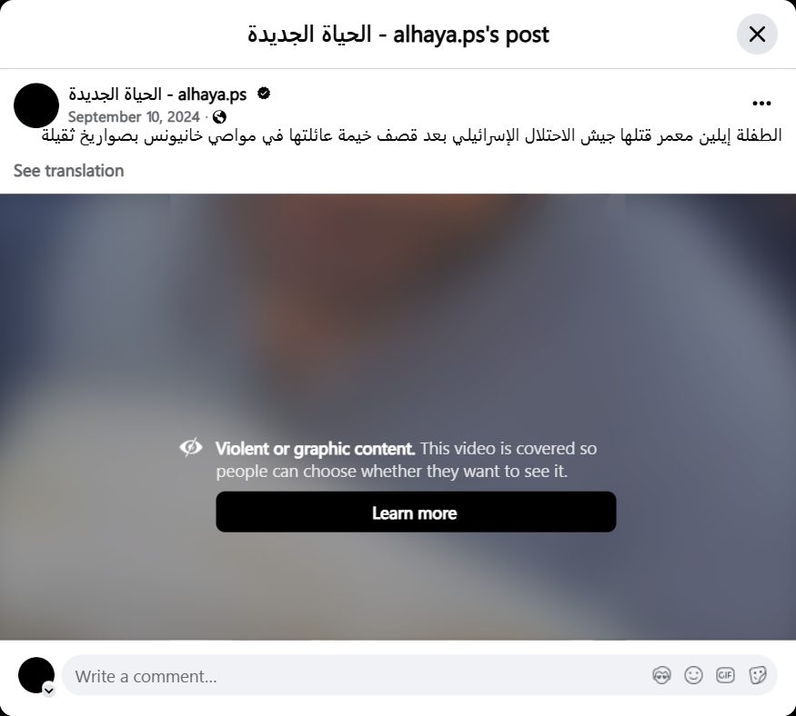 الطفلة إيلين معمر قتلها جيش الاحتلال الإسرائيلي بعد قصف خيمة عائلتها في مواصي خانيونس بصواريخ ثقيلة