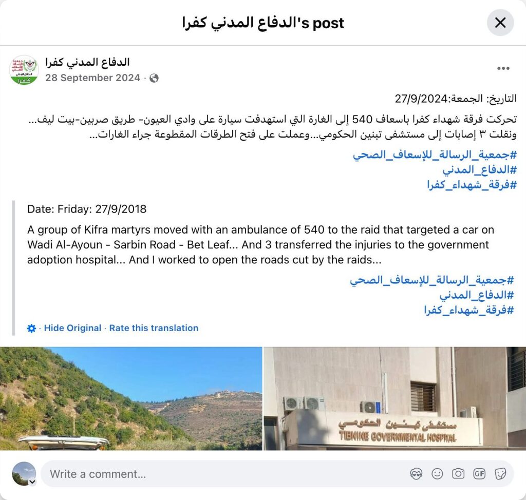 تحركت فرقة شهداء كفرا باسعاف 540 إلى الغارة التي استهدفت سيارة على وادي العيون- طريق صربين-بيت ليف… ونقلت ٣ إصابات إلى مستشفى تبنين الحكومي…وعملت على فتح الطرقات المقطوعة جراء الغارات…