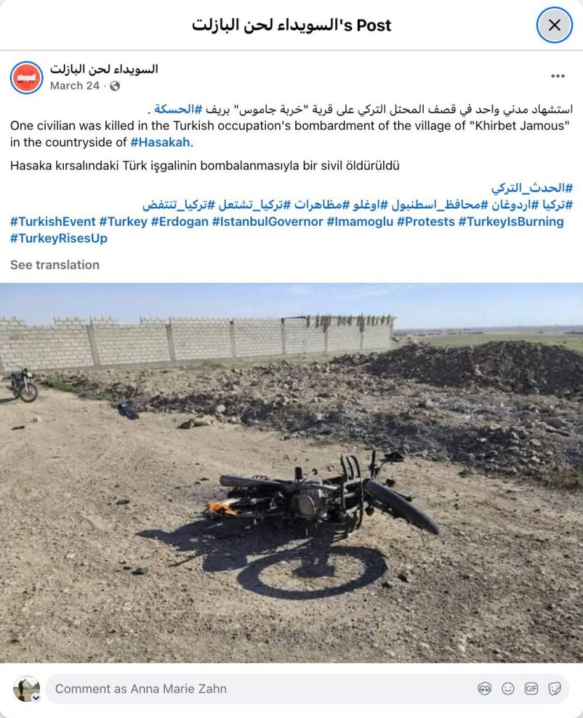 One civilian was killed in the Turkish occupation's bombardment of the village of "Khirbet Jamous" in the countryside of #Hasakah.