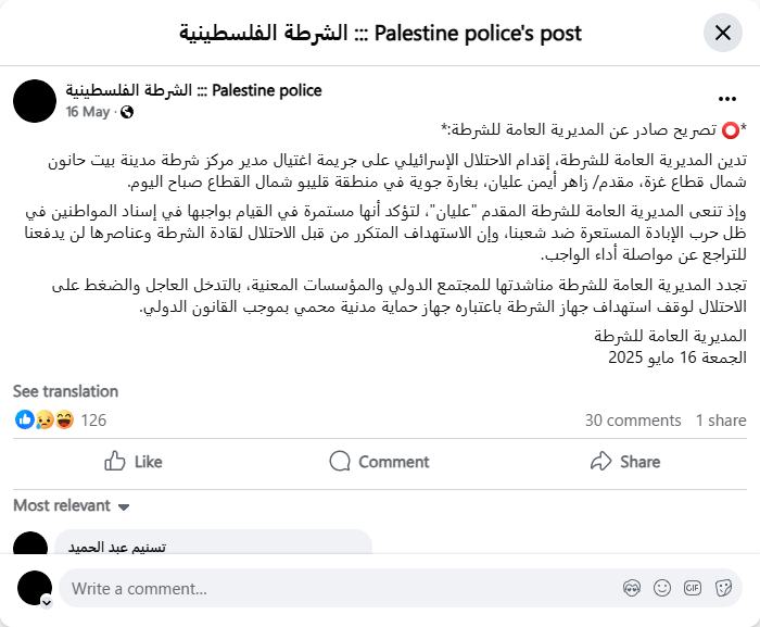 * Statement issued by the General Directorate of Police: * The General Directorate of Police condemns the Israeli occupation's assassination of the Director of the Beit Hanoun Police Station in the northern Gaza Strip, Lieutenant Colonel Zaher Ayman Alian, in an airstrike in the Qalibu area, north of the Strip, this morning. The General Directorate of Police mourns Lieutenant Colonel "Alian" and affirms that it will continue to carry out its duty to support citizens in light of the raging war of extermination against our people, and that the repeated targeting by the occupation of police leaders and personnel will not push us to retreat from continuing to perform our duty. The General Directorate of Police renews its appeal to the international community and relevant institutions to urgently intervene and pressure the occupation to stop targeting the police force, as it is a civil protection force protected under international law. General Directorate of Police Friday, May 16, 2025