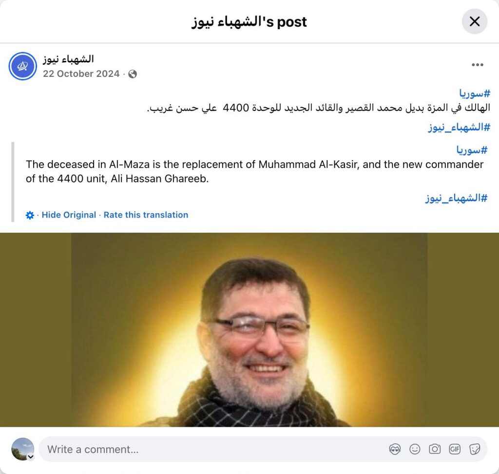 The deceased in Al-Maza was Muhammad Al-Kasir's replacement, and the new commander of Unit 4400 is Ali Hassan Ghareeb.