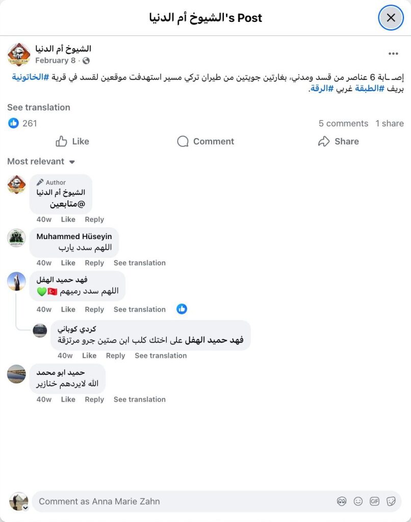 Six members of the SDF and a civilian were injured in two airstrikes by Turkish drones targeting two SDF positions in the village of #Al-Khatouniya in the countryside of #Al-Tabqa, west of #Al-Raqqa.