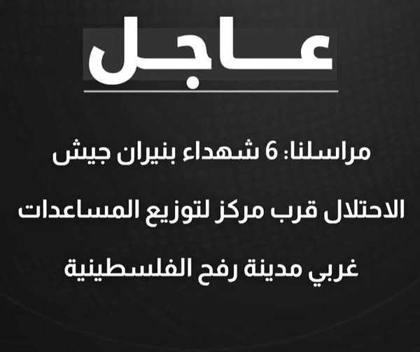 #Urgent | 6 martyrs by Israeli occupation army fire near an aid distribution center west of the Palestinian city of Rafah.