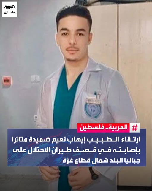 ارتقاء الطبيب إيهاب نعيم ضميدة متأثرًا بإصابته في قصف طيران الاحتلال على جباليا البلد شمال قطاع غزة
