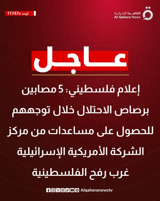 #عاجل | إعلام فلسطيني: 5 مصابين برصاص الاحتلال خلال توجههم للحصول على مساعدات من مركز الشركة الأمريكية الإسرائيلية غرب #رفح الفلسطينية#القاهرة_الإخبارية