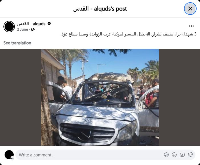3 شهداء جراء قصف طيران الاحتلال المسير لمركبة غرب الزوايدة وسط قطاع غزة.