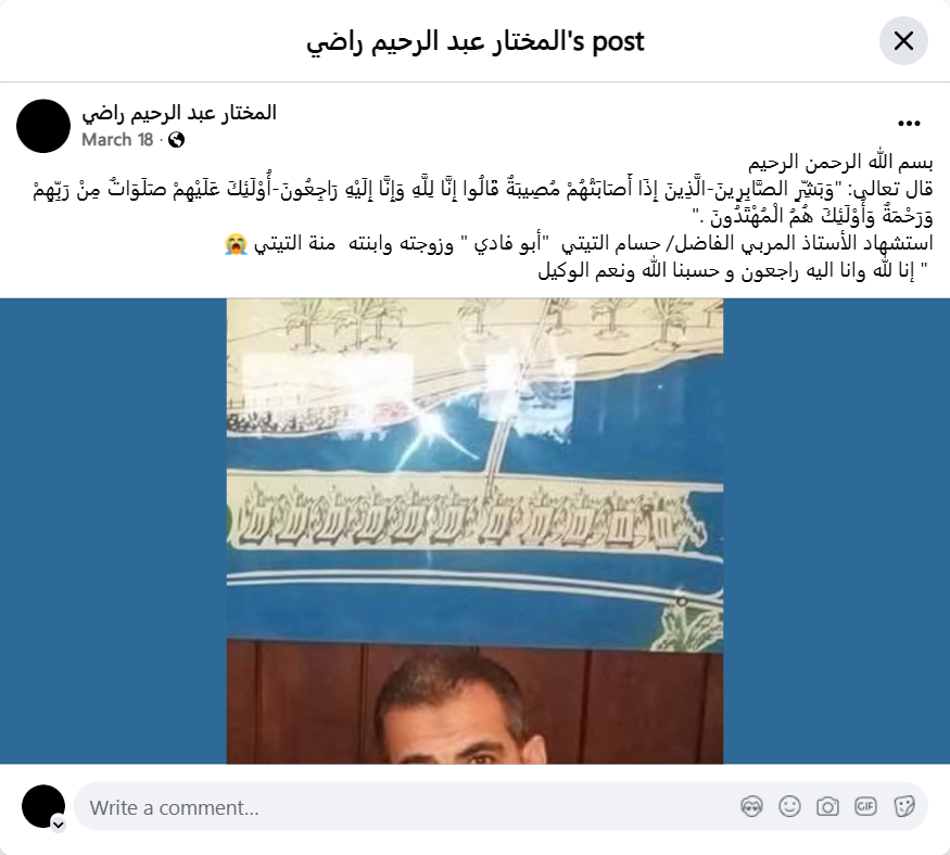 The martyrdom of the virtuous educator, Hussam Al-Titi "Abu Fadi," his wife, and his daughter, Mona Al-Titi.