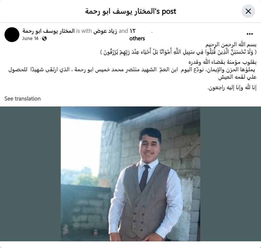 In the name of God, the Most Gracious, the Most Merciful. “And never think that those who have been killed in the cause of Allah are dead. Rather, they are alive with their Lord, and they are provided for.” With hearts that believe in God’s will and destiny, filled with sadness and faith, we bid farewell today to our cousin, the martyr Montaser Muhammad Khamis Abu Rahma, who was martyred while trying to obtain a living.