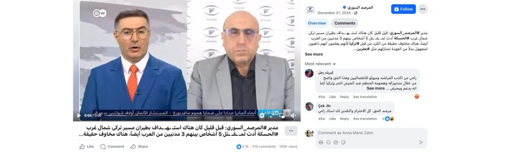 مدير #المرصد_السوري: قبل قليل كان هناك استـ ـهـ ـداف بطيران مسير تركي شمال غرب #الحسكة أدت لمـ ـقـ ـتل 5 أشخاص بينهم 3 مدنيين من العرب أيضاً، هناك مخاوف حقيقة من الكرد من قبل #تركيا لأنهم يعلمون أنهم ذاهبون لمجهول بدلاً من العودة لمنازلهم مثل #عفرين، هناك اشتباكات مسلحة بين الفصائل الموالية لتركيا ومجلس منبج العسكري وقسد على ضفتي #الفرات قرب سد #تشرين وحالة مخيفة تنتظر الكرد وقسد وما هو التالي لانعلم، المفاوضات معلنة لايوجد والشخص الذي عين كوزير الخارجية هو سيتسلم الملف الكردي أو ملف التعاون مع قسد ضمن حكومة #دمشق ونتمنى أن يكون بطريقة سورية وطنية لكي لا يكون إراقة للـ ـد م السوري وأن يكون برعائة أمريكية فهي لاعب قوي في الملف السوري، هناك منطقة غرب #سوريا هناك مئات الشبان والمجندين والضباط الذين لا علاقة لهم بالعمليات القـ ـتـ ـالـ ـية مع الأسد بسجن #حماة المركزي رغم التسويات في عدة مناطق نطالب بالإفراج عنهم حتى لا تتحول إلى سجون الأسد