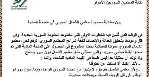 #Syrian_Observatory The Free Teachers Syndicate denounces the exclusion of teachers in northern Syria from the financial grant and demands justice and fairness.