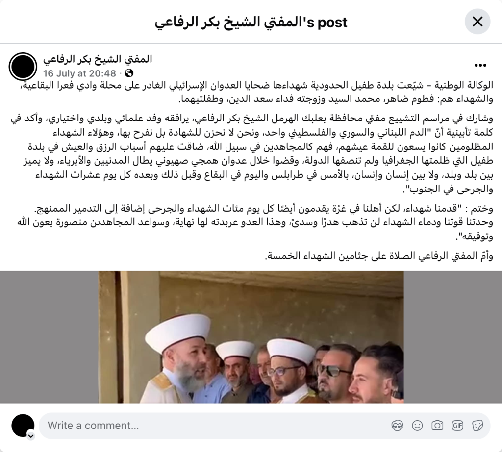 The National Agency - The border town of Tufail bid farewell to its martyrs, victims of the treacherous Israeli aggression on the Wadi Fara area in the Bekaa. The martyrs are: Fatoum Daher, Muhammad al-Sayyid and his wife Fidaa Saadeddine, and their two daughters. The Mufti of Baalbek-Hermel Governorate, Sheikh Bakr al-Rifai, participated in the funeral ceremony, accompanied by a delegation of scholars, municipal officials, and elected officials. He stressed in a eulogy that “Lebanese, Syrian, and Palestinian blood is one, and we do not grieve for martyrdom, but rather rejoice in it. These oppressed martyrs were striving to earn a living. They are like mujahideen in the path of God, and the means of livelihood and living were narrow for them in the town of Tufail, which was wronged by geography and was not treated fairly by the state. They died during a barbaric Zionist aggression that targets civilians and innocents, and does not differentiate between one country and another, or between one person and another. Yesterday in Tripoli and today in the Bekaa, and before that and after that, every day dozens of martyrs and wounded in the south.” He concluded: “We have offered martyrs, but our people in Ghra also offer everything they need.” A day of hundreds of martyrs and wounded, in addition to the systematic destruction. Our unity is our strength, and the blood of the martyrs will not be in vain. This enemy's rampage has an end, and the arms of the mujahideen are victorious, with God's help and guidance." Mufti Al-Rifai led the funeral prayers for the five martyrs.