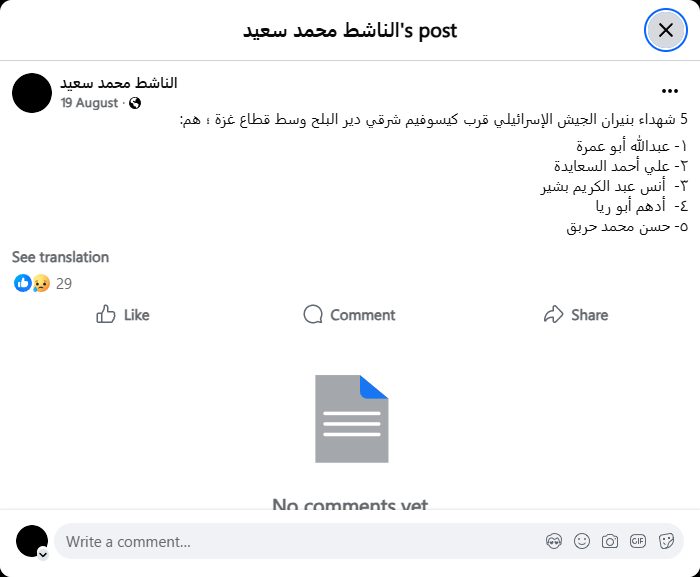 Five martyrs were killed by Israeli army fire near Kissufim, east of Deir al-Balah, in the central Gaza Strip. They are: