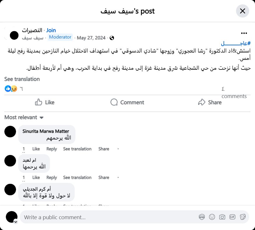 Dr. Rasha Al-Ajouri and her husband, Shadi Al-Dasouki, were martyred last night when the occupation forces targeted the tents of displaced people in Rafah.