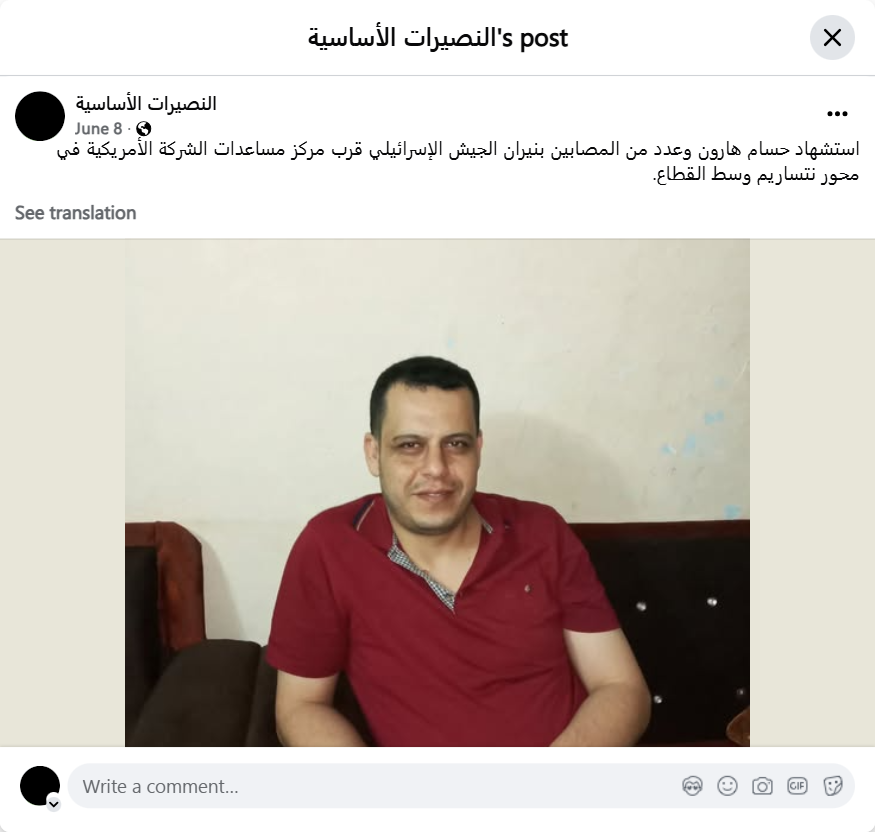 Hussam Haroun was killed and several others were injured by Israeli army fire near the American aid center on the Netzarim axis in the central Gaza Strip.