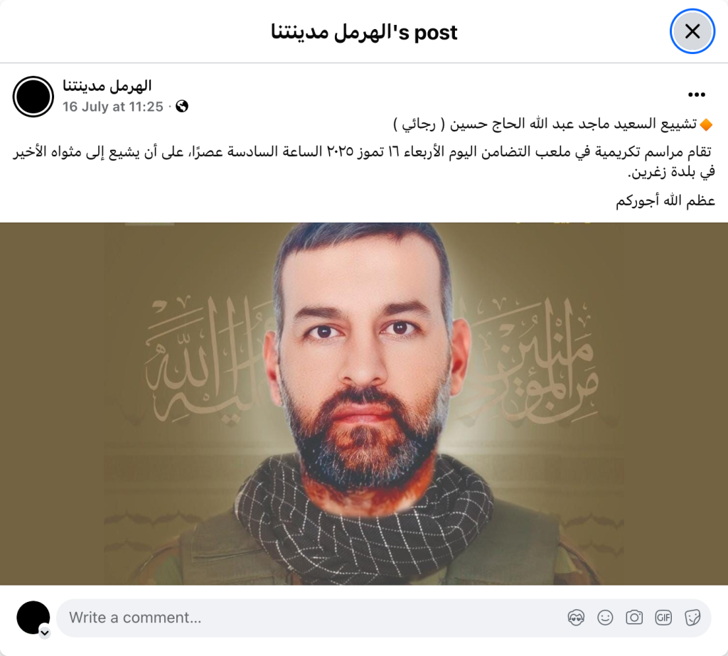 A memorial ceremony will be held at Al-Tadamon Stadium today, Wednesday, July 16, 2025, at 6:00 PM, and he will be laid to rest in the town of Zghrin.