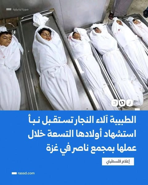 Dr. #Alaa_Al-Najjar, a pediatrician at Nasser Hospital, was today grieved by the most difficult thing a mother's heart can experience... She received the bodies of her #seven_children, one after the other, martyred under the rubble of the bombing. 1- Yahya Hamdi Al-Najjar 2- Rakan Hamdi Al-Najjar 3- Raslan Hamdi Al-Najjar 4- Gebran Hamdi Al-Najjar 5- Eve Hamdi Al-Najjar 6- Revan Hamdi Al-Najjar 7- Sayed Hamdi Al-Najjar What heart can bear to have its children ripped from it all at once? She was treating people's children, watching over their pain, and she didn't know that today her children would be in the martyrs' section instead of the treatment section. The aggression does not differentiate between a doctor and a child, a home and a hospital, or one life and another.