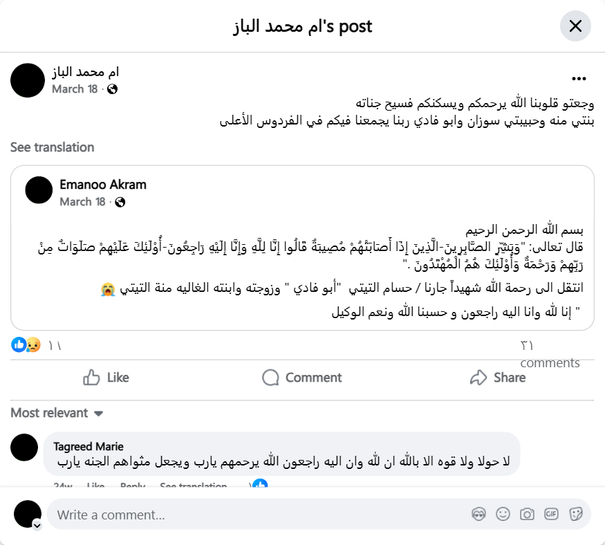 You broke our hearts. May God have mercy on you and grant you a place in His spacious heavens. My daughter, Manal, my beloved Suzan, and Abu Fadi. May God gather us with you in the highest paradise.