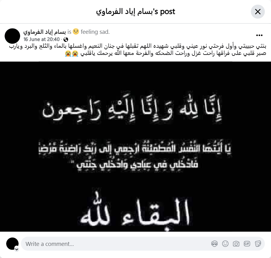 بنتي حبيبتي وأول فرحتي نور عيني وقلبي شهيده اللهم تقبلها في جنان النعيم واغسلها بالماء والثلج والبرد ويارب صبر قلبي على فراقها راحت غزل وراحت الضحكه والفرحة معها الله يرحمك ياقلبي