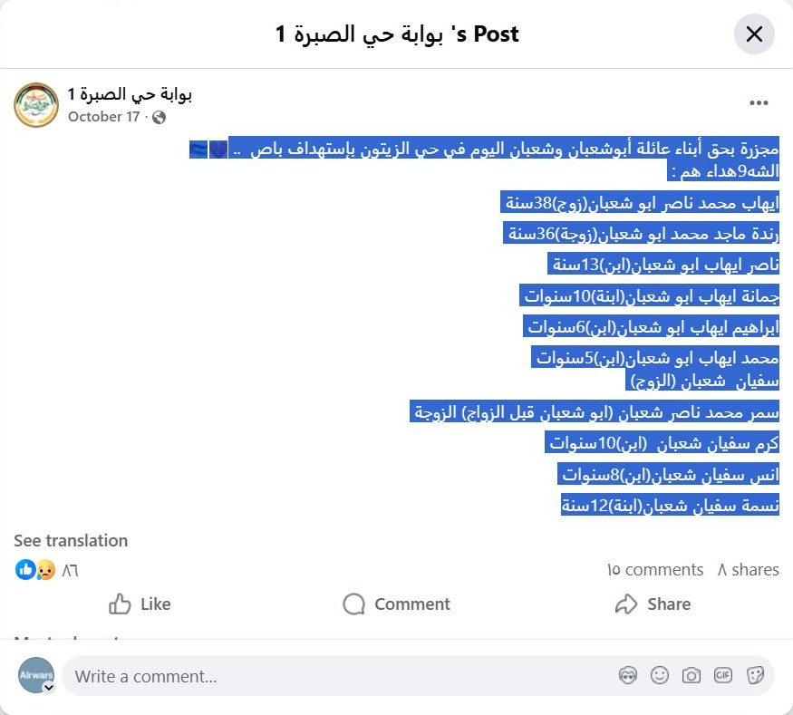 A massacre was perpetrated against the Abu Shaaban and Shaaban families today in the Zeitoun neighborhood, targeting a bus. The martyrs are: