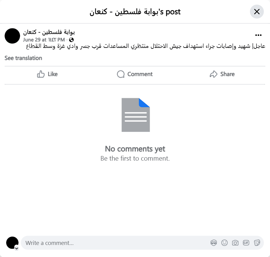 Urgent | One martyr and several injuries as the Israeli occupation forces targeted people waiting for aid near the Wadi Gaza Bridge in the central Gaza Strip.