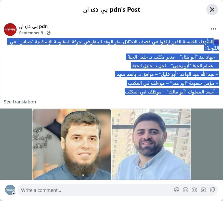 الشُّهداء الخمسة الذين ارتقوا في قصف الاحتلال مقر الوفد المفاوض لحركة المقاومة الإسلامية "حماس" في الدّوحة: