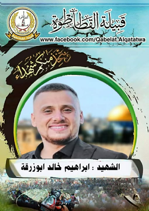 Al-Qatatwa Camp, this camp that words fail to describe, which offers every day a moon from its sons, the ascension of a new moon from the sons of the Qatawa tribe in the Qatawa camp: Ibrahim Khaled Ibrahim Abu Zarqa, who ascended as a martyr at dawn today in the Al-Alam area west of Rafah, to join the moons of the Qatawa tribe, may God have mercy on him and accept him into the highest paradise in heaven.