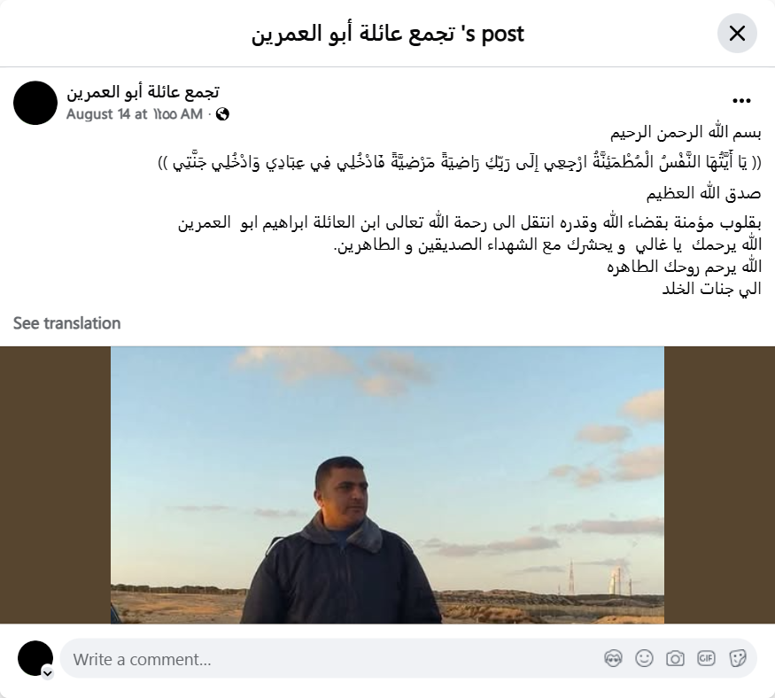 With hearts that believe in God's will and destiny, Ibrahim Abu Al-Omrain, a member of the family, has passed away.