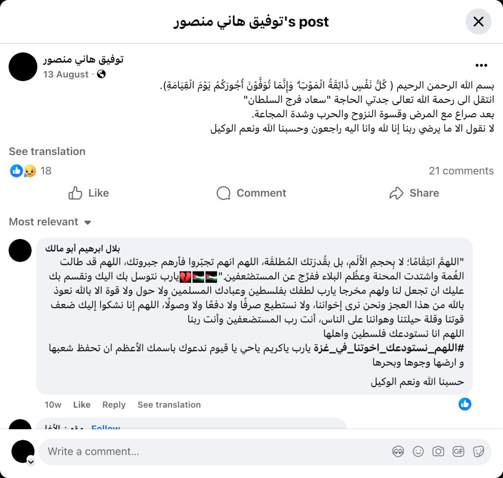 My grandmother, Hajjah Suad Faraj Al-Sultan, passed away after a struggle with illness, the harshness of displacement, war, and severe famine.