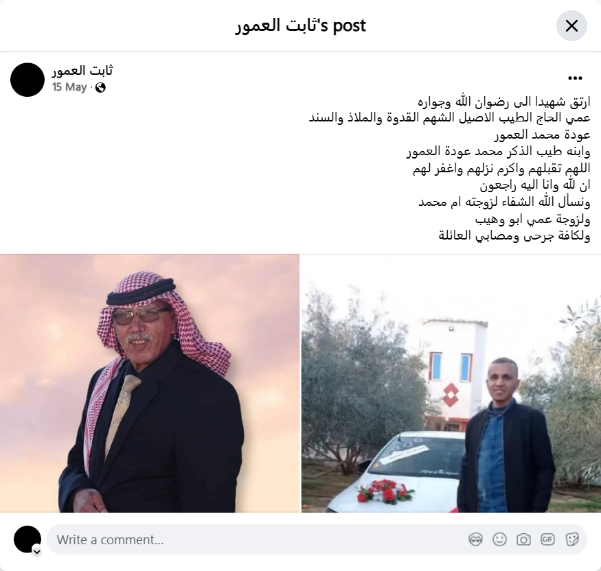 My dear Hajji, the good, noble, generous, role model, refuge, and support, Awda Muhammad Al-Amur, and his son, the good-natured Muhammad Awda Al-Amur, have ascended as martyrs to the pleasure and company of God. May God accept them, honor their abode, and forgive them. We belong to God and to Him we shall return. We ask God to heal his wife, Umm Muhammad, and the wife of my uncle Abu Wahibul, and all the wounded and injured of the family.