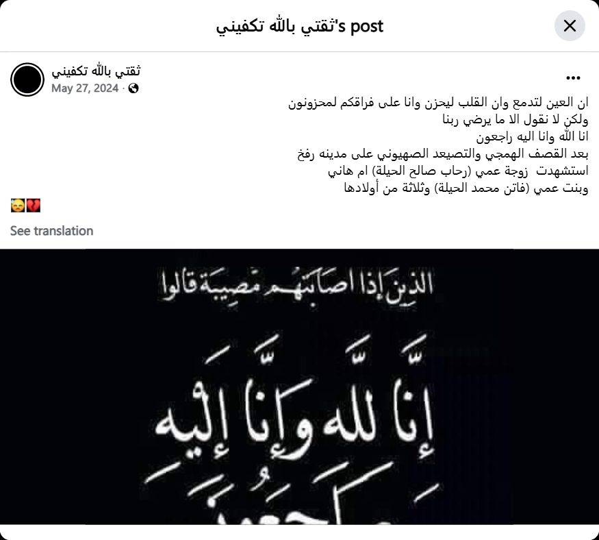 The eye sheds tears, the heart grieves, and we are truly saddened by your departure. But we only say what pleases our Lord. To God we belong and to Him we shall return. After the barbaric bombing and Zionist escalation on the city of Rafah, my uncle's wife (Rehab Saleh Al-Hila), Umm Hani, was martyred, along with my cousin (Faten Mohammed Al-Hila), and three of her children.