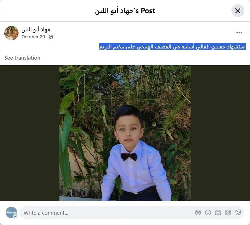 My dear grandson Osama was martyred in the barbaric bombing of Al-Bureij camp.